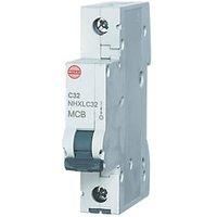 Miniature circuit breaker with front-operated din rail release clip, dolly switch reset mechanism and in-built tunnel shield. 'No miss' tunnel terminals on top and bottom. DIN Rail Mounted Fitting Type C Curve Dolly Switch Reset Mechanism 'No Miss' Tunnel Terminal Tunnel Shield Covers Gap When Tightened - Manufacturers part number: NHXLC32
