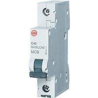 Miniature circuit breaker with front-operated din rail release clip, dolly switch reset mechanism and in-built tunnel shield. 'No miss' tunnel terminals on top and bottom. DIN Rail Mounted Fitting Type C Curve Dolly Switch Reset Mechanism 'No Miss' Tunnel Terminal Tunnel Shield Covers Gap When Tightened - Manufacturers part number: NHXLC40