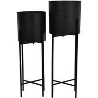 With the sleek and stylish black antique textured finish, this Clyde planter set is perfect for modern homes that prize more contemporary styles and the timelessness of monochrome shades. Each planter comes with powder coated black stand. Also available in antique brass for a more ornate aesthetic. Large Planter meaurements - W26 x D26 x H76cm. Small Planter measurements - W24 x D24 x H66cm | Libra Interiors Clyde Floor Standing Matt Black Set of 2 Planters