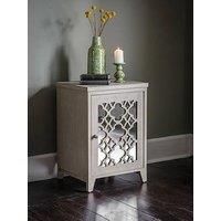 Laura Ashley Greystead Wooden Mirrored Chest A stunning ensemble featuring a distressed hand finish and elegant mirror glass fronts. Timeless, stylish single cabinet featuring solid wooden frame in a distressed, washed paint finish. This cabinet has a single door and could be used beside a bed or sofa or anywhere where an elegant storage solution is required. The single door features mirrored glass behind which sits a single removeable central shelf. Clearance height above and below central shelf in eac...