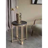 Libra Interiors Dalston Sandblasted Wood & Champagne Side Table A blend of timeless elegance and modern minimalism. Featuring seasoned mango wood with a sandblasted black finished wood and hand-distressed detailing, the Dalston side table complements its geometric form with a rustic bronze metal frame and sturdy cross-legged support. Perfect for adding sophisticated style to any contemporary space, the Dalston Side Table features angled detailing on the edges in a subtle aged champagne finish. The Dalst...