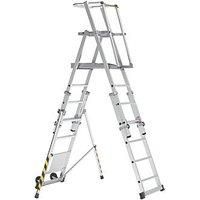 Versatile and safe solution for use on flat ground or stairways. Extra-large standing platform measures 66 x 44cm, with robust aluminium toe board. Double guardrails with safety chain, allowing for free hands and secure work area, offering 360 protection during use. Easy rung-by-rung adjustment system with platform heights at: 1.05, 1.3, 1.6 and 1.83m, with a safe working height between 3.05 and 3.83m. Closed to Max. Open Height: 2.44 - 2.86m Max. Static Vertical Load: 150kg Professional Use Anti-Slip F... - Manufacturers part number: 32851500