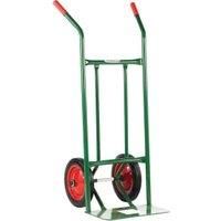 This is a traditional sack truck with a 200 kg carrying capacity equipped with a large base plate handle grips and solid wheels.
