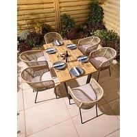 The Rowlinson Oslo 6 Seat Dining Set comprises of a 160cm hardwood table top with steel legs and six natural coloured rope weave dining chairs. This stylish dining set has a contemporary look and can be used both indoor and outdoor. Features: Seven piece set - comprising of a table and six chairs Durable Acacia hardwood table top with powder-coated steel legs Chairs with contemporary rope weave design over a powder-coated steel frame 65mm thick seat pads included - Light grey colour Adjustable table fee... - Manufacturers part number: OSLSET6160