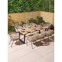 The Rowlinson Oslo 8 Seat Dining Set comprises of a hardwood table top with steel legs and eight natural coloured rope weave dining chairs. This stylish dining set has a contemporary look and can be used both indoor and outdoor. Features: Nine piece set - comprising of a table and eight chairs Durable Acacia hardwood table top with powder-coated steel legs Chairs with contemporary rope weave design over a powder-coated steel frame 65mm thick seat pads included - Light grey colour Adjustable table feet- ... - Manufacturers part number: OSLSET8