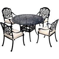 - AESTHETIC APPEARANCE: The cast aluminium construction of your new dining set helps to accentuate a contemporary yet standout feature piece to add to your garden. The set has an elegant design that is unique and attractive. It includes a circular table, four arm chairs and four beige cushions and would be ideal placed on a patio or decking.