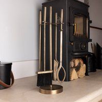 Consisting of poker, tongs, coal shovel and brush, this iron Companion Set is manufactured to a high standard with a brass finish, and is ideal for stoking and keeping the fire alive on a cold night. Perfect for open fires and wood burners, this beautifully crafted Companion Set will also look good in your living while you remain oblivious to the cold outside. Features: Contemporary Design, Essential Tools, Minimalist, Circular Base, Powder Coated finish Specifications: Dimensions: H:62.0 x W:22.0 x D:2... - Manufacturers part numbers: HMFIRESIDE13|30824887