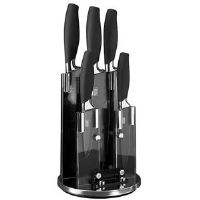 - ✅ IN THE BOX - Spinning knife holding block with black & chrome finish. Kitchen tools; 3 ½” 9cm PARING (de-veining, removing seeds), 5” 12cm ALL PURPOSE COOK'S (cutting fruit/veg e.g. tomato), 8” 20cm BREAD (loaf, bloomer, bun, bap, baguette, muffin, etc.), 8” 20cm CARVING (meat) and large universal 8” 20cm CHEF'S KNIFE (general purpose). You won't need any other knives in your cutlery drawer!