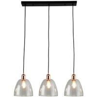 The Grove is a three light clear glass brushed copper and matt black ceiling bar pendant. The black flex cables can be adjusted before installation from 16 cm minimum and has a maximum height of 100 cm. For rooms with higher ceilings and for use in dining areas. Dimmable if used with dimmable lamps. 3 x E27 golf LED lamps required.