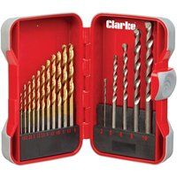 A really useful combination set of tungsten carbide tipped drill bits for masonry, and titanium coated bits for drilling numerous other material types - timber, plastic, MDF & plasterboard etc. Titanium coating means these bits last much longer than ordinary HSS bits. - Manufacturers part numbers: Clarke_|1801765