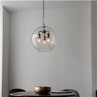 An industrial styled pendant light with glass shade, finished in aged pewter and aged copper, making it bang up to date with on-trend 'resto' styling. Height adjustable with authentic knurled lamp holder details. Perfect when paired with filament LED lamps. Features: 2 year warranty Industrial style on-trend design Aged pewter and aged copper plated finish Clear glass shade Height adjustable 1.2 metre clear cable Dimmable Twin with E27 LED filament lamps to complete the look Specifications: Dimensions...