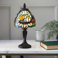 * Traditional, Colourful Design* Dark Bronze-Effect Base* Subtle Floral Pattern* Requires: SES E14 Cap Type & Standard (GLS) Bulb Add a touch of traditional elegance with the Vogue Lighting Flora Traditional Table Lamp. Its small size and dark bronze-effect base complement the brightly coloured Tiffany-style glass shade, adorned with a subtle floral pattern. - Manufacturers part numbers: 30912778|64331