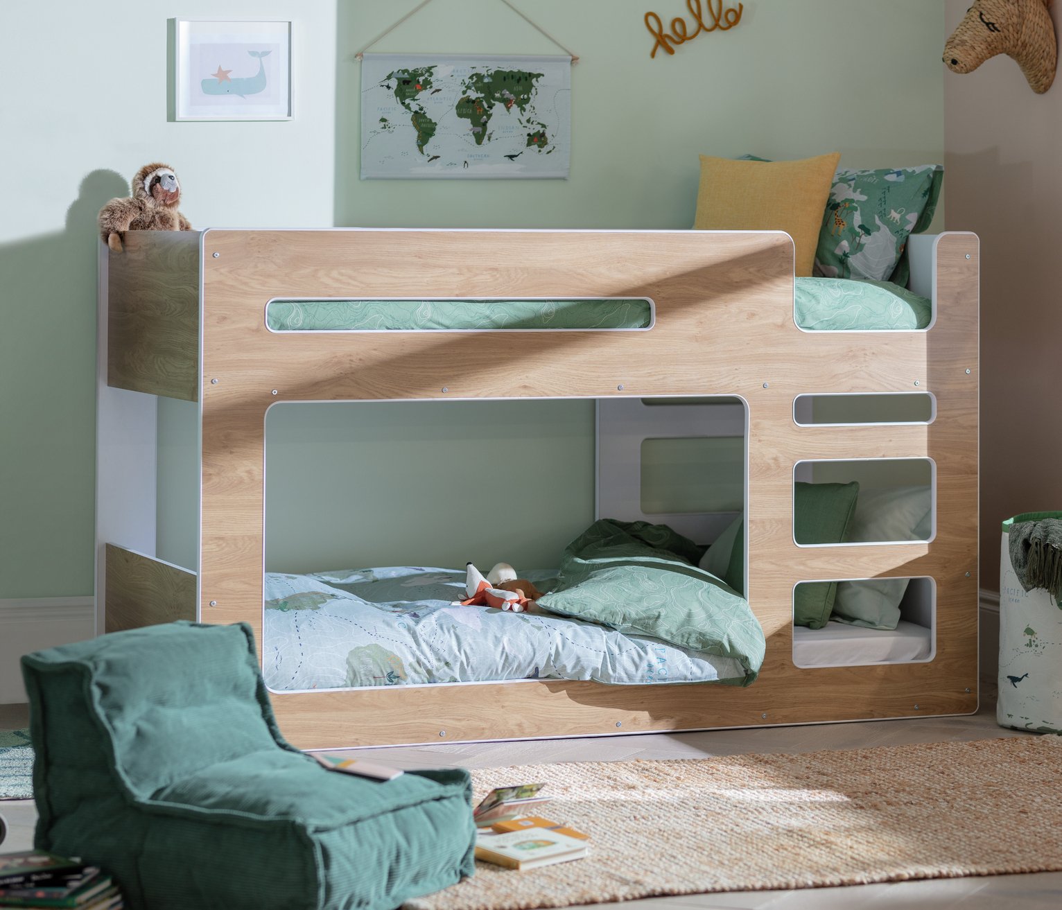 Its double the fun with the ultimate reversible bunk bed. One side features an eggshell white colour while the reverse is in a natural oak grain finish. With curved edges, a fixed ladder and wooden slats the bunk bed is all about simple style and robust design. With smooth sides and ends, theres lots of display space for drawings, notes and posters for kids to make it their own. Part of the Ultimate collection. Bunk:Single bed. Two tone bed with a particleboard frame. Includes plywood slats. Self-assemb...