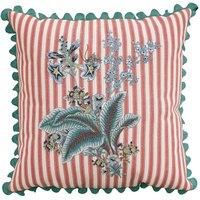 A decorative square cushion completes this look for Rubus in the bedroom. The cushion is enveloped in a printed stripe in Raspberry & Ivory with an embroidered flower detail on the front and a scallop edge in teal. Produce in 100% cotton duck. - Manufacturers part number: Sanderson_5016709686280