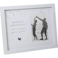A 'Diamond Anniversary' frame by Amore by Juliana. This elegant frame features a crisp white wooden border, white card mount, silver foil debossed floral design, silver plated heart icon, easel style standing strut and 'Diamond Anniversary' title with '60 Wonderful Years Together' sentiment in complementary silver font. The portrait aperture is designed to be displayed using either the attached strut or wall hook. - Manufacturers part number: 30937151