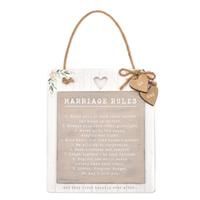 * Boho style* Portrait orientation* Rope attached for hanging on walls* Made from wood The wooden Marriage Rules hanging plaque from Love Story by CELEBRATIONS evokes the rustic charm of a quintessential barn wedding. It features a white wooden background with a light grey central plate, decorated with a green eucalyptus leaf and pink flower design. The plaque's " MARRIAGE RULES" title is written in a white typewriter-style font, and it includes natural finish wooden hearts labeled " MR" and " MRS... - Manufacturers part number: 30937181