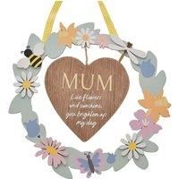 A 'Mum' wreath plaque from The Cottage Garden by Celebrations. This wonderfully decorated wooden wreath plaque features beautiful painted flowers - accompanied by bees, dragonflies, and butterflies - all showcasing gorgeous pastel colours. Inside the wreath hangs a wooden heart, complete with gold 'Mum' sentiment, making a heart-warming decoration for their living space. - Manufacturers part number: 30984557
