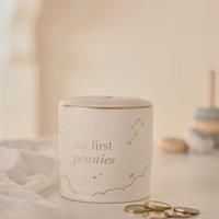 Introducing a charming stoneware money bank featuring the 'First Pennies' design from BAMBINO BY JULIANA. This exquisite money bank offers an ideal beginning for saving towards exciting adventures that await. It showcases a moon and stars motif with intricate 'My First Pennies' accents, includes a coin and folded note slot, and opens conveniently at the base. The money bank is predominantly white in color, with elegant gold detailing that adds to its appeal. - Manufacturers part number: 30932940