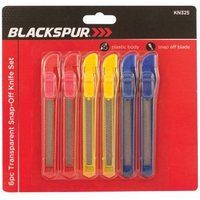 SPECIFICATIONThis set contains 6 small transparent snap-off knives, each fitted with a safety blade lock.BARCODE 5017403 013372CARTON QTY 36/12 Sets APPROX ITEM WEIGHT 78gPACKAGING Blister Card - Manufacturers part number: Blackspur_BB-KN325