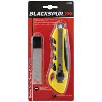 SPECIFICATIONThis retractable knife is manufactured with a plastic body with soft touch grip, safety locking screw & easyopen blade compartment. It is ideal for various cutting uses & comes supplied with 3 spare blades packed in ahandy storage case.Approx Blade Size: 18mmBARCODE 5017403 080930CARTON QTY 48/24 Pcs APPROX ITEM WEIGHT 110gPACKAGING Slide Blister - Manufacturers part number: Blackspur_BB-KN309