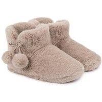 Totes Toasties Ladies Faux Fur Boot Slippers - Oat Embrace comfort and style with the totes toasties Ladies Faux Fur Boot Slippers in a soft oat shade. These fluffy, cosy slippers feature a plush faux fur lining, cushioned memory foam for added comfort, and charming tie pom pom details. Perfect for pairing with jeans, leggings or pyjamas, they also boast a durable sole for everyday practicality. Beautifully packaged, they make a delightful gift or a luxurious treat for yourself.