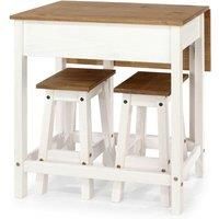 Our Space saving solid pine breakfast set including a drop leaf table and 2 matching stools in white wash wax finish. Features: Solid pine White wash wax frame with antique wax top Modern compact styled furniture Easy to assemble Drop leaf table top Specifications: Dimensions: H:76.0 x W:70.0 x D:40/72 .0 cm Colour: Natural Pine and White Material: Solid Pine Self Assembly Required: Yes