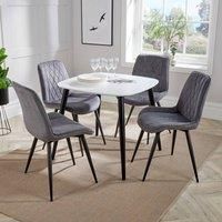 The Aspen dining set is perfect for small kitchens, dining rooms, or open-plan living areas. It features an 80 x 80cm curved-edge white painted table with sturdy tapered black steel legs and adjustable feet for stability. Supplied with four upholstered cord fabric chairs available in blue, grey, light grey, or natural, each with diamond stitch detailing and a contoured seat and back for comfort. Its modern styling and soft rounded corners make it ideal for compact spaces, and the set is supplied flat-pa...