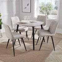 The Aspen small dining set is perfect for compact dining or kitchen areas. It features an 80 x 80cm curved-edge table top in grey oak-effect MDF with tapered black steel legs, complete with adjusters for uneven floors. The set comes with four upholstered chairs available in blue, grey, light grey, or natural, featuring diamond stitch detailing, contoured seats and backs for comfort, and tapered steel legs with floor protectors. Its modern design with soft rounded corners makes it ideal for small spaces,...