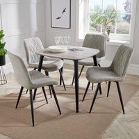 The Aspen small dining set is perfect for compact dining or kitchen areas. It features an 80 x 80cm curved-edge table top in grey oak-effect MDF with tapered black steel legs, complete with adjusters for uneven floors. The set comes with four upholstered chairs available in blue, grey, light grey, or natural, featuring diamond stitch detailing, contoured seats and backs for comfort, and tapered steel legs with floor protectors. Its modern design with soft rounded corners makes it ideal for small spaces,...