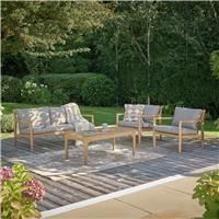 The Malta Lounge Set offers a refined, stunning design that will give your garden a contemporary update with its modern natural finish Acacia wood frame, complemented with soft grey cushions. Perfect for lounging in the sun or enjoying long summer evenings. The set includes a 2-seater sofa, 2x armchairs, and a coffee table, that can complement an outdoor space or indoor setting alike and is equally perfect for use in a conservatory or garden room. Parasol base not included. Parasol not included. Include... - Manufacturers part number: 30893667