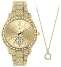 Spirit ladies gold colour bracelet watch and necklace set. Step into fashionable elegance with our stunning timepiece & necklace gift set. This gold plated watch features a pale gold satin dial with a polished gold case and matching stap. Paired with a beautiful gold circle necklace with a stunning stone setting , creating an irresistible combination- whether as a gift for someone special or. . An indulgent treat for yourself Set includes Necklace and watch. Watch features:Model number ASPL182. Gold dia...