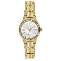 Spirit Ladies Gold Plated Stone Set Bracelet This Spirit ladies gold plated stone set white mother of pearl bracelet watch is a sophisticated and modern timepiece. The sleek gold plated case features a shimmering clear stone set bezel and houses a mesmerising white mother-of-pearl dial adorned with striking pale gold numerals. This statement timepiece is complimented by a polished metal bracelet strap and comes with official Spirit packaging and a one year guarantee. Depth: 8 MM Height: 200 MM Width: 26... - Manufacturers part number: SP4042