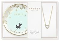 Radley 18ct Gold Plated Stone Set Open Heart Pendant Necklace and Trinket Tray Set. This beautiful gift set features a 18ct gold plated open heart clear stone charm necklace on a fine box chain. The set also includes a 10cm round ceramic trinket tray, printed with a Make a Wish Radley print. Presented in a beautiful Radley Set gift box. Part of the Radley Gifting collection. Base metal. Necklace:Glass stone set. Chain thickness 1.02mm. Total weight of necklace approximately 4.66g. Earrings:EAN: 50184791... - Manufacturers part number: RYJ2464S-TKS-SET