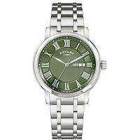 Rotary Rotary Men's Heritage Stainless Steel Bracelet Watch This Rotary Heritage watch combines classic design with contemporary watchmaking. Set beneath a mineral glass crystal, the rich olive green dial is accented by silver Roman numerals and a subtle textured centre. A day-date display at 3 o'clock enhances everyday practicality, while the polished stainless steel case and polished five-link bracelet deliver a sophisticated silhouette. Powered by a precise quartz movement, it's a versatile timepi... - Manufacturers part number: RGB10023/24