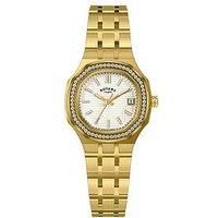 Rotary Ladies Brilliance White Dial Gold Plated Stainless Steel Bracelet Watch The Rotary Brilliance blends contemporary design with timeless femininity. Its distinctive gold PVD 30mm octagonal case is set with sparkling crystals that catch the light with every movement. A white tapisserie dial echoes the geometric charm of the case, while sleek gold tone baton hour markers and a practical date window at 3 o'clock offer refined functionality. Powered by a reliable quartz movement and water-resistant to...