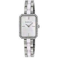 Radley Ladies White Ceramic Silver Bracelet Watch Radley Silver Bracelet Watch. This elegant watch features a sleek rectangular case in polished silver tone, beautifully framed by a clear stone-set bezel for a hint of sparkle. The dial showcases a stunning rainbow-effect mother of pearl finish, offering a luminous backdrop that shifts delicately in the light. The matching silver bracelet is finished with glossy white ceramic centre links, blending modern design with timeless elegance. Presented in a bea... - Manufacturers part number: Radley_5018479163572