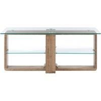 Elevate your living room with the Orsina Media Unit, a perfect blend of elegance and functionality. This modern wood TV unit features a symmetrical lattice base, adding a contemporary touch to any space. Topped with clear tempered glass, it offers a sleek surface for your television and media accessories. The clean-lined base, visible through the glass, provides an elegant aesthetic, while the square glass shelf on each side offers additional storage. Crafted with a veneer finish and white faux graining...
