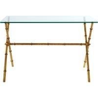 Elevate your home decor with the Orsina Console Table, a stunning blend of modern design and timeless elegance. This console table features a unique bamboo-shaped metal frame with a luxurious distressed gold finish, bringing an elegant touch to any space. The glass top is made from clear tempered glass, offering a sleek and contemporary appearance that complements a variety of interior styles. Designed to make a statement, this long console table is perfect for use as a hallway table or in any room wher...