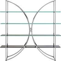 The Curved Design Shelf Unit from Orsina offers a contemporary storage solution that combines functionality with style. Its stainless steel frame features a reflective finish that enhances any room's brightness, making it a perfect centerpiece for modern interiors. The frame is paired with four black tempered glass shelves, creating a bold contrast that elevates the visual appeal of your space. Measuring H170 x L170 x W36 cm, this shelving unit is designed to provide ample display space while maintaini...