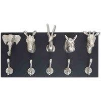 This five hook wall hanger is skilfully handcrafted from robust metal and rendered to different animal heads. The hanger hooks are neatly fixed on a black rectangular base and given a silver nickel finish to create an instant focal point on the wall. Features: Robust metal Carved detailing Silver nickel finish Five hooks of animal heads Black rectangular base Specifications: Dimensions: H:11.0 x W:58.0 x D:26.0 cm Colour: Silver Guarantee:12 Months Material: Glass, Metal Model Number: 5506012 Self Assem...