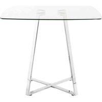 Made of metal, this dining table has a modern base with clean intersecting lines in a sleek silver finish. A square glass top provides an airy aesthetic and allows to see the open base while adding a sense of lightness to the overall look. Features: Clear glass tabletop Silver finish metal legs Lattice legs Sleek and minimalist Modern aesthetic Specifications: Dimensions: H:76.0 x W:90.0 x D:90.0 cm Colour: Silver Guarantee:1 Year Material: Metal, Glass Model Number: 2401690 - Manufacturers part number: 2401690