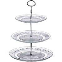 Host the perfect tea party with this three tier cake stand. Each tier is slightly concaved, which prevents sandwiches and baked goods rolling off the plates. Floral designs decorate the rims, while intricate diamond shapes produce a geometric pattern towards the centre. The metal stem which supports the tiers is pillared, with a handle at the top which allows one to revolve the stand. Features: Decorative cut glass surface Fluted stem 3 differently-sized tiers Display edible treats Everyday use Specific... - Manufacturers part numbers: _|1402623