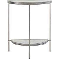 This console table with a semi-circle profile will look elegant against the hallway or entryway wall. The antique mirrored top sits above the black metal frame complete with a matching lower shelf for open storage. Features: Semi circle design Antique mirror glass Distressed effect Sleek metal frame Contemporary Specifications: Dimensions: H:77.0 x W:71.0 x D:36.0 cm Colour: Black Guarantee:1 Year Material: Glass, Metal, Model Number: 2406313