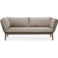 This three-seat sofa is expertly hand-woven and complemented with bronze and charcoal fabric cushions and a seat. The foam-padded seat provides optimum comfort, while the tapered wooden legs lend stability and mid-century aesthetics to the living area.
