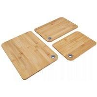 "This set of three natural bamboo chopping boards are ideal for everyday use. Coming in varied sizes, each lightweight flat board is supplied with a silicone hook allowing convenient storage and easy carrying." Features: Natural bamboo Three sizes Round silicone handles Lightweight Durable Specifications: Dimensions: H:1.0 x W:35.0 x D:25.0 cm Colour: Brown Material: Wood, Synthetic Model Number: 1104819