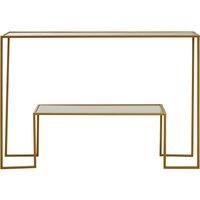 This console table features a small secondary table attached to the main frame. The frame is slender and minimalist, allowing the table to blend in any decor. The tempered glass tops offer resistance to everyday wear and tear. | Orsina Avento Gold Finish Console Table