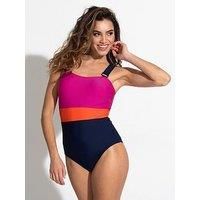 Pour Moi Colour Block Tummy Control Swimsuit Colour blocking is so in this season! With its wide straps, secret support shelf and feature detail components, you can be on trend without sacrificing the fit in our Colour Block Tummy Control Swimsuit. Be an instant influencer in this suit! Embrace responsible fashion choices with the Colour Block Tummy Control Swimsuit that contains recycled content. Tummy control swimsuit Material Content: Poly amide 80 %, Elastane 20 % Wide padded adjustable straps On-tr...