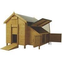 Manufactured from dip-treated, kiln-dried, planed, imported northern hemisphere timber. Hinged lid and doors to nesting box area. Supplied with roofing felt and hardware. Base not included. 4 Chicken Capacity 2 Perches 12mm Tongue & Groove Cladding OSB Roof Grey Felt Roof Frame & Cladding Panels Dip-Treated Softwood with Honey Brown Basecoat 3 x Doors Without Lock 1 Year Guarantee - Manufacturers part number: 1336G