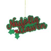 Show off your Welsh pride this Christmas with the Festive 'Nadolig Llawen' hanging tree decoration which showcases the Welsh translation of 'Merry Christmas'. Featuring a red and green colour scheme with a classic holly sprig plus some glitter detailing and a gold hanging loop, this hanging tree decoration is a poignant choice to add a touch of cultural significance to your home this festive season.