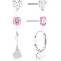 H. Samuel Children's Sterling Silver Cubic Zirconia & Heart Charm 3 Set Of Earrings This charming set includes three pairs of silver earrings designed for children, offering versatile and elegant options for any occasion. The set features heart-shaped cubic zirconia studs, round pink cubic zirconia studs, and a pair of sleepers adorned with a delicate hanging heart charm, all crafted from sterling silver to add a touch of sparkle to any outfit. Fashion Jewellery Type: Sets Items Available: N Metal Type...